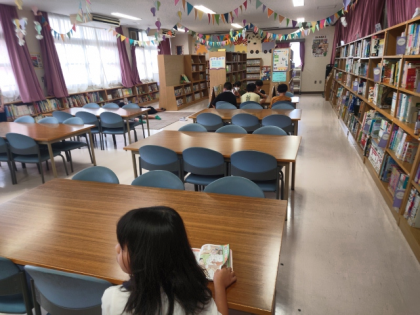 20分休みに、子どもたちが図書室で本を読んでいます。