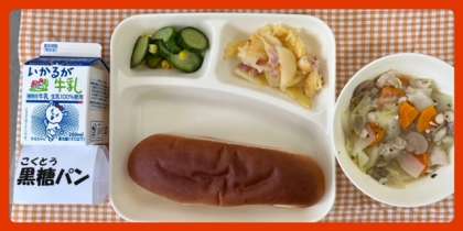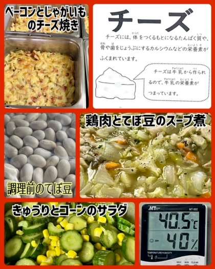 今日の献立は、鶏肉とてぼ豆のスープ煮・ベーコンとじゃがいものチーズ焼き・きゅうりとコーンのサラダ・黒糖パン・牛乳でした。