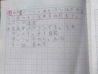 社会科の時間は、工場でつくられたパンが、どのようにお店に運ばれるのか調べました。
