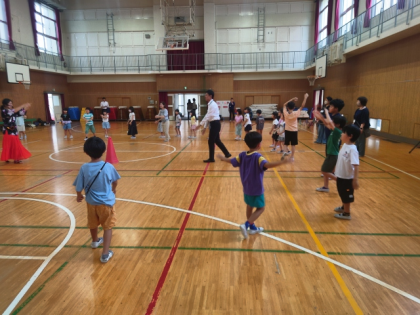放課後、体育館で、地域の方を講師として「盆踊り練習会」を行いました。