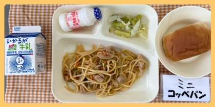 今日の献立は、チキントマトスパゲッティ・グリーンアスパラガスとキャベツのサラダ・発酵乳・ミニコッペパン・牛乳でした。