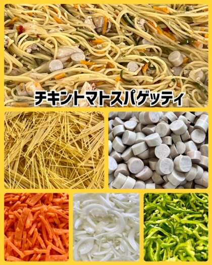 「チキントマトスパゲッティ」は、鶏肉、ウインナーを主材に、たまねぎ、トマト(缶)、にんじん、ピーマンを使用し、バジルで風味をつけたトマト味のスパゲッティです。今日は、約12kgのスパゲッティを使用しています。