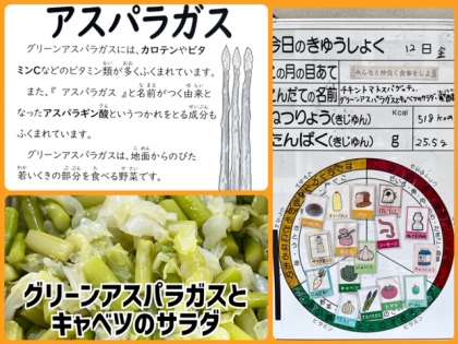 「グリーンアスパラガスとキャベツのサラダ」は、焼き物機で蒸したグリーンアスパラガスとキャベツを砂糖、塩、ワインビネガー、綿実油で作ったドレッシングであえたものです。