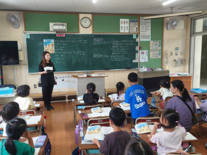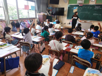 算数科の時間は、教科書のイラストを見ながら、「3+4」や「7ー3」の式になるお話をみんなで考えました。