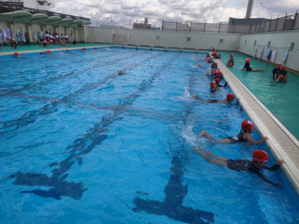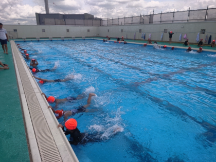 今日のプール学習は、音楽に合わせて水慣れをしたあと、プールサイドをつかみながら、ばた足の練習をしました。