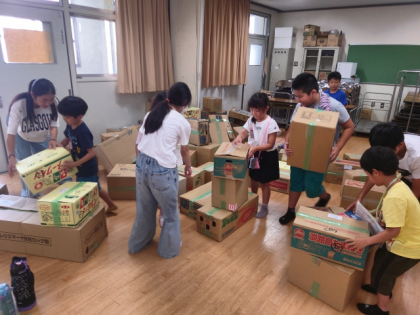 1年生を招待し、さかなつり、ボーリング、ドリブル、わなげ、たまいれ、だんボールつみなどいろいろなゲームをして2学年いっしょに楽しくすごしました。