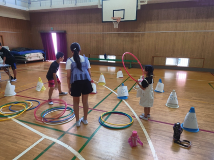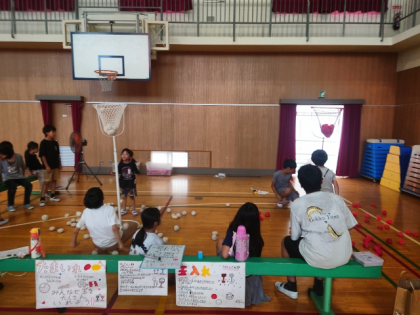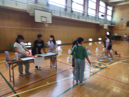 1年生を招待し、さかなつり、ボーリング、ドリブル、わなげ、たまいれ、だんボールつみなどいろいろなゲームをして2学年いっしょに楽しくすごしました。