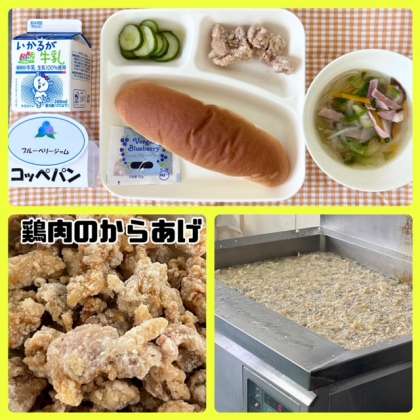 今日の献立は、鶏肉のからあげ・ハムとはるさめのスープ・きゅうりの中華あえ・コッペパン・ブルーベリージャム・牛乳でした。1学期最後の給食です。