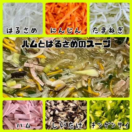 「ハムとはるさめのスープ」は、ハムを主材にしいたけで旨みを増し、たまねぎ、にんじん、青みにチンゲンサイを使い、彩りよく仕上げています。はるさめを使用し、ボリュームを出しています。