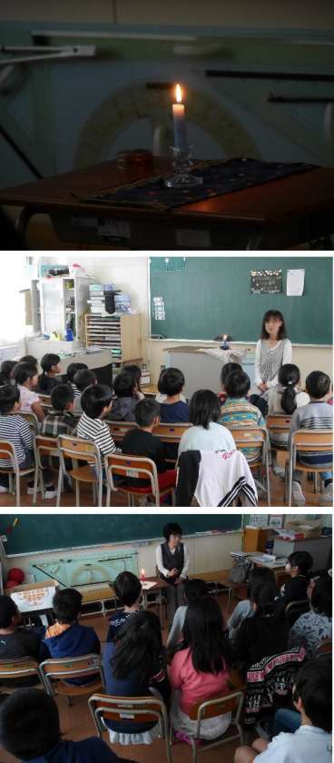 おはなし会では、最初にヘビさんが登場したり、おさるさんが登場したりしていただきました。おはなしの世界へひきこまれていきます。そして、ろうそくがつけられ暗くなるとお話の始まりです。本を読むのでなく、ろうそくをみつめながらお話が語られます。どんどんおはなしの世界にひきこまれていきます。