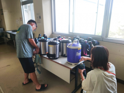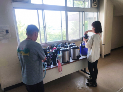 子どもたちが朝食を食べている間に、一人一人の水筒にお茶を入れています。