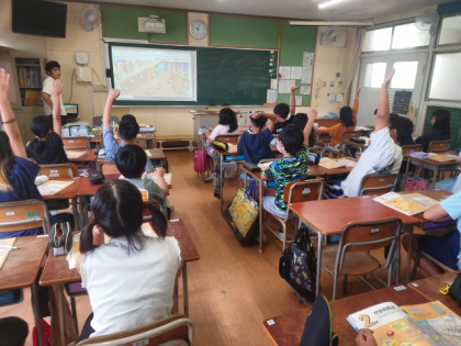 保健の学習の時間は、「けがの防止」について、教科書の街のようすや学校の中のイラストを見て、事故やけがにつながりそうな場面を見つけ、事故やけがを防ぐために大切なことについて話し合いました。