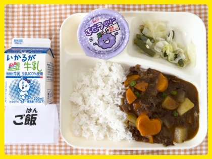 今日の献立は、ビーフカレーライス・野菜のピクルス・ぶどうゼリー・牛乳です。
