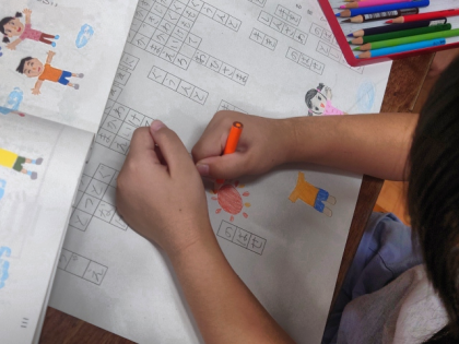 国語科の時間は、教科書の「空に ぐうんと 手を のばせ」の詩を視写しました。