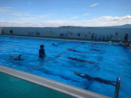 水慣れの後、クロールや平泳ぎの足の動きなどの練習をしました。