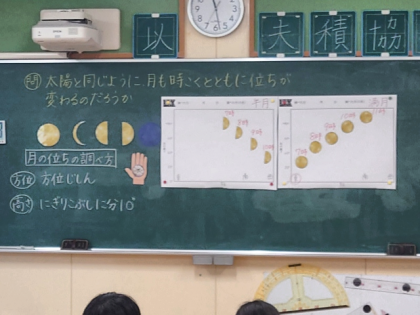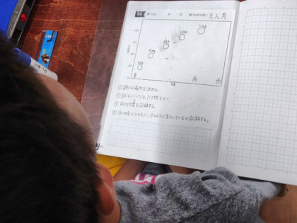 今日は、「月も太陽と同じように、時刻とともに位置が変わるのかどうか」という課題について、動画を見ながら月の動きを調べました。