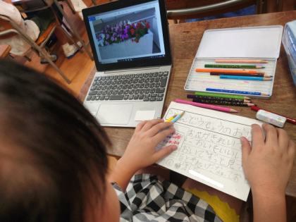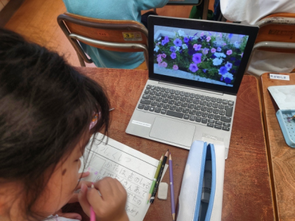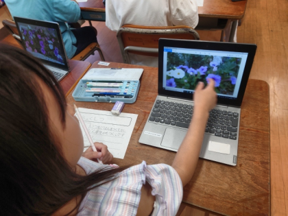 生活科の時間は、「学校のすてきなところ」を学習用端末で撮影し、写真をもとにしてカードにまとめました。