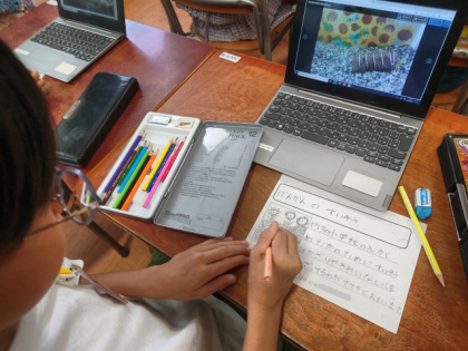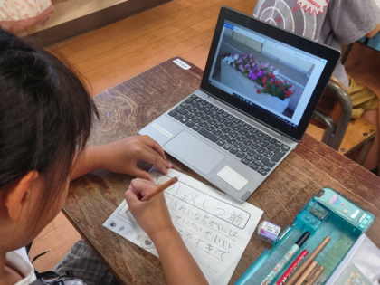生活科の時間は、「学校のすてきなところ」を学習用端末で撮影し、写真をもとにしてカードにまとめました。