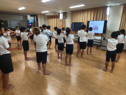 測定の前に、養護教諭から、けが防止のための「にこにこ体操」を指導しました。