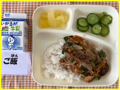 今日の献立は、マーボーあつあげ丼・あっさりきゅうり・りんご(カット缶)・牛乳でした。