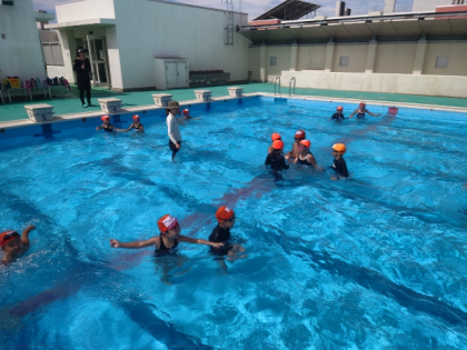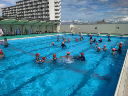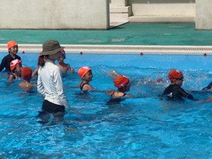今日は、音楽に合わせてダンスをしながらもぐったりジャンプしたりして水に慣れたあと、「水中手つなぎおにごっこ」をしました。