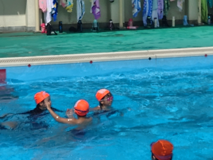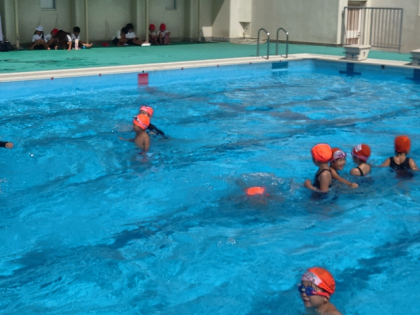 今日は、音楽に合わせてダンスをしながらもぐったりジャンプしたりして水に慣れたあと、「水中手つなぎおにごっこ」をしました。