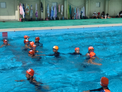 そのあと、「いっかいてん」「せんすいかん」「みずかけ」「わくぐり」「しゅちゅうじゃんけん」など、カードに書いてあることをクリアしながら進んでいく「わくわく水中ランド」を楽しみました。