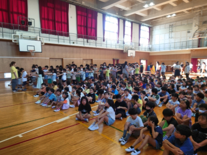 2学期最初の児童朝会は、講堂に全校児童が集まって行いました。