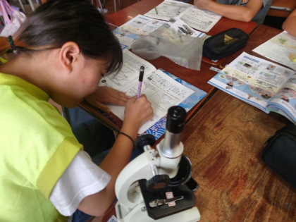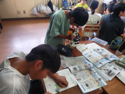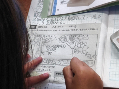 今日は、顕微鏡で、おしべの先についている花粉のようすを詳しく観察し、ノートにまとめました。