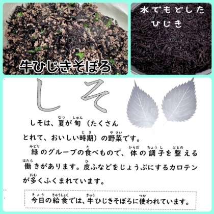 「牛ひじきそぼろ」は、牛ひき肉とひじきを甘辛く味つけし、しそで風味をつけています。今日は約400gのひじきを使用しています。配食時にご飯に添えていただきます。
