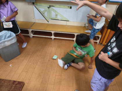 今日は、厚紙とゴムを使って「ぱっちんがえる」を作って遊びました。