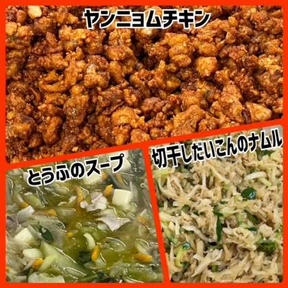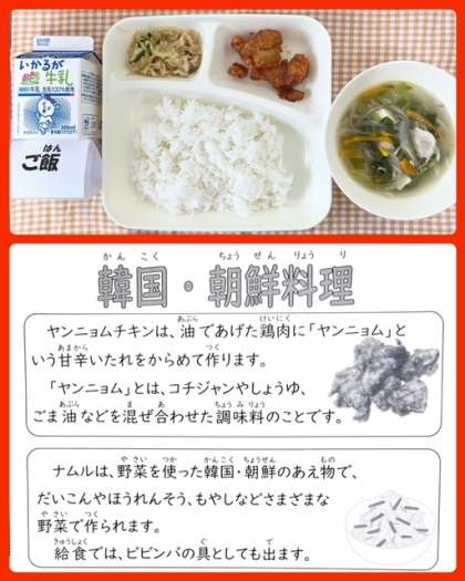 今日の献立は、ヤンニョムチキン・とうふのスープ・切干しだいこんのナムル・ごはん・牛乳でした。