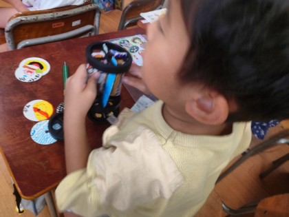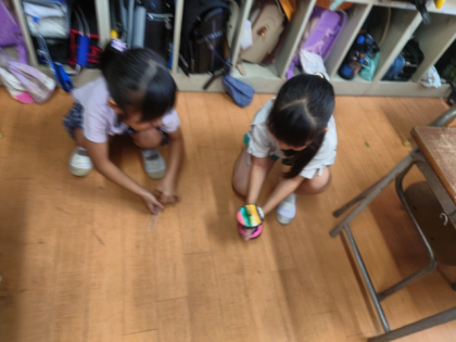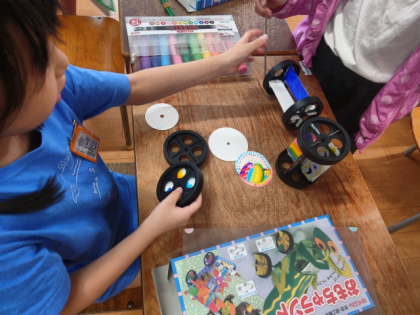 生活科の時間は、車輪の形の部品を使って、走ったり回ったりするおもちゃを作り、楽しく遊べるか試してみました。