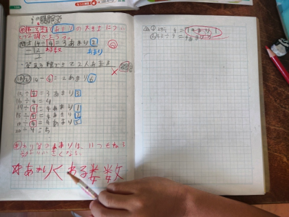 今日は、わり算の式で「わる数」と「あまり」がどんな関係があるのか調べました。