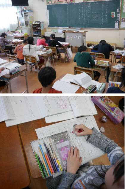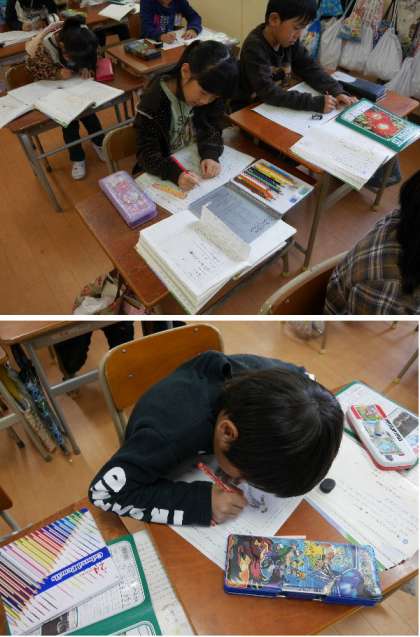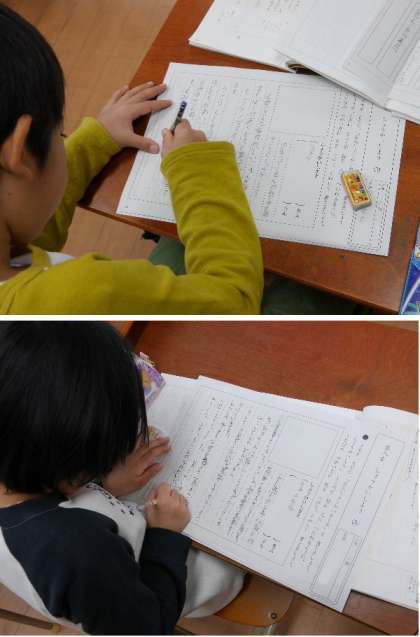 2年生の国語では、名人紹介カードを書いています。「字がじょうずな人」「あいさつがじようずな人」「カメラがじょうずな人」「料理がじょうずな人」「リンゴの皮むきがじょうずな人」など、身近にいている人で名人を探して、その人を紹介する文章をつくっています。いろんな名人がいてるんですね。子どもたちはとてもよく周りをみていますね。