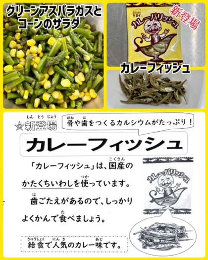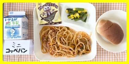 今日の献立は、イタリアンスパゲッティ・グリーンアスパラガスとコーンのサラダ・カレーフィッシュ・ミニコッペパン・牛乳でした。