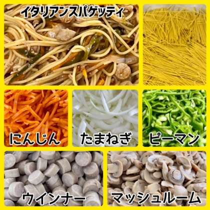 「イタリアンスパゲッティ」は、豚肉、ウインナーを主材に、たまねぎ、にんじん、ピーマン、マッシュルームを使用したケチャップ味のスパゲッティです。