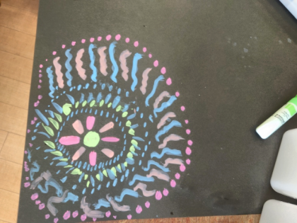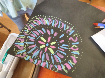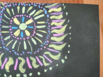 図工科の時間は、好きな4色の絵の具をパレットに出し、白をまぜてきれいな色を作り、筆先をうまく使って、黒い画用紙に花火を描いていきました。