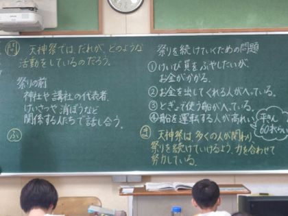 社会科の時間は、天神祭りではだれがどのような活動をしているのか副読本などをもとに調べました。