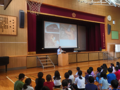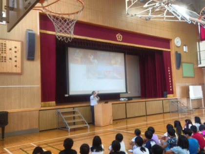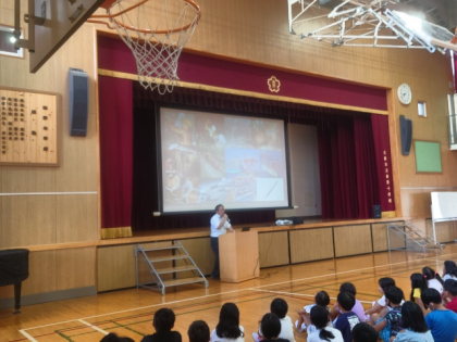 今日の児童朝会は、講堂に全校児童が集まって行いました。