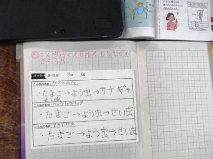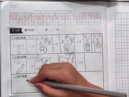 理科の時間は、カブトムシやアキアカネ、ショウリョウバッタがたまごから成虫になるまでのようすを調べてノートにまとめました。