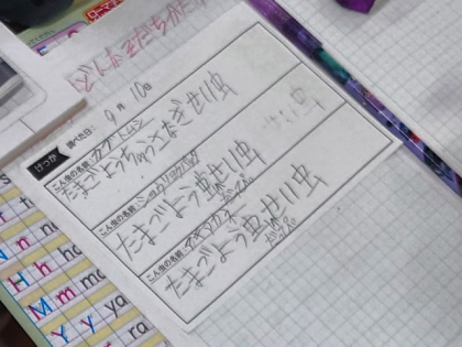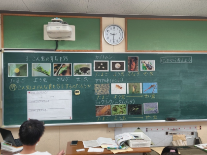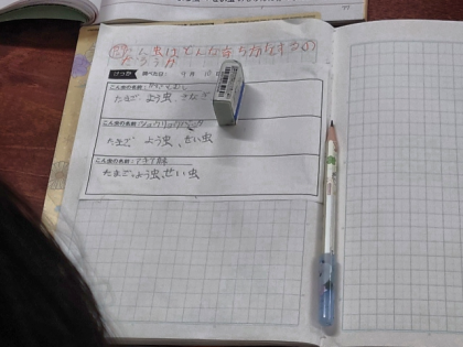 理科の時間は、カブトムシやアキアカネ、ショウリョウバッタがたまごから成虫になるまでのようすを調べてノートにまとめました。
