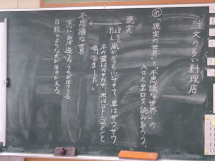 今日の学習のめあては、「『現実の世界』と『不思議な世界』の入口と出口を読み取ろう」。