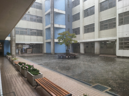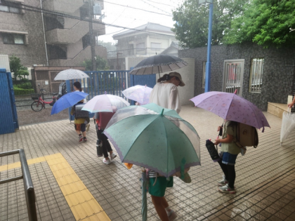 雷も鳴っていたので、いったんは教室待機も考えましたが、6時間目の終わりごろには雷がやみ、雨も小降りになったので、時間通り下校することができました。