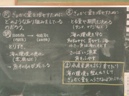 今日は、漁獲量を増やすための取り組みについて学習しました。