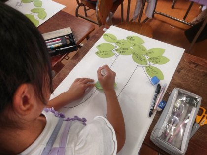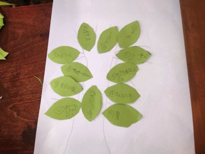 自分の「好きな食べ物」、「好きな教科」、「好きな動物」、「たからもの」、「将来の夢」、「好きな色」、「好きな遊び」、「得意なこと」、「好きな木」、「好きな場所」、「好きな季節」、「自分のいいところ」を葉っぱに書いて、「わたしの木」を作りました。