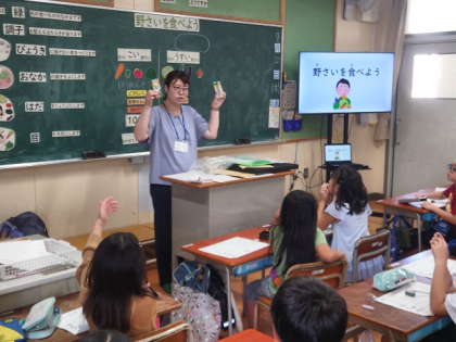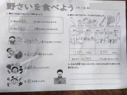 「野菜を食べるとどんなよいことがあるのか」ということや、「野菜を『色の濃いもの』『色のうすいもの』に仲間分けして、1日にどれぐらいの量を摂ればよいのか」などのことについて学びました。