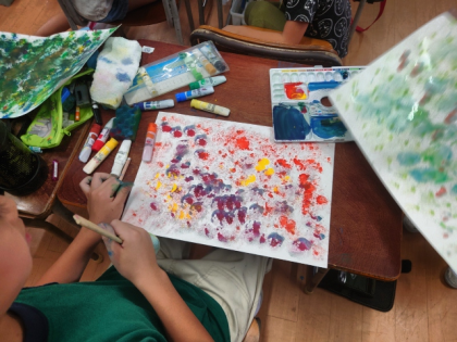 図工科の時間は、スポンジやにじみなど絵の具の様々な技法を使って、画用紙4〜5枚にいろいろな模様を描きました。