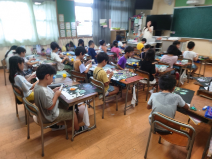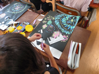 図工科の時間は、好きな4色の絵の具をパレットに出し、白をまぜてきれいな色を作り、筆先をうまく使って、黒い画用紙に花火を描いていきました。
