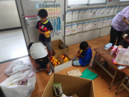 子どもたちは家で集めたたくさんの箱をいろいろと組み合わせながら、楽しく活動に取り組んでいました。